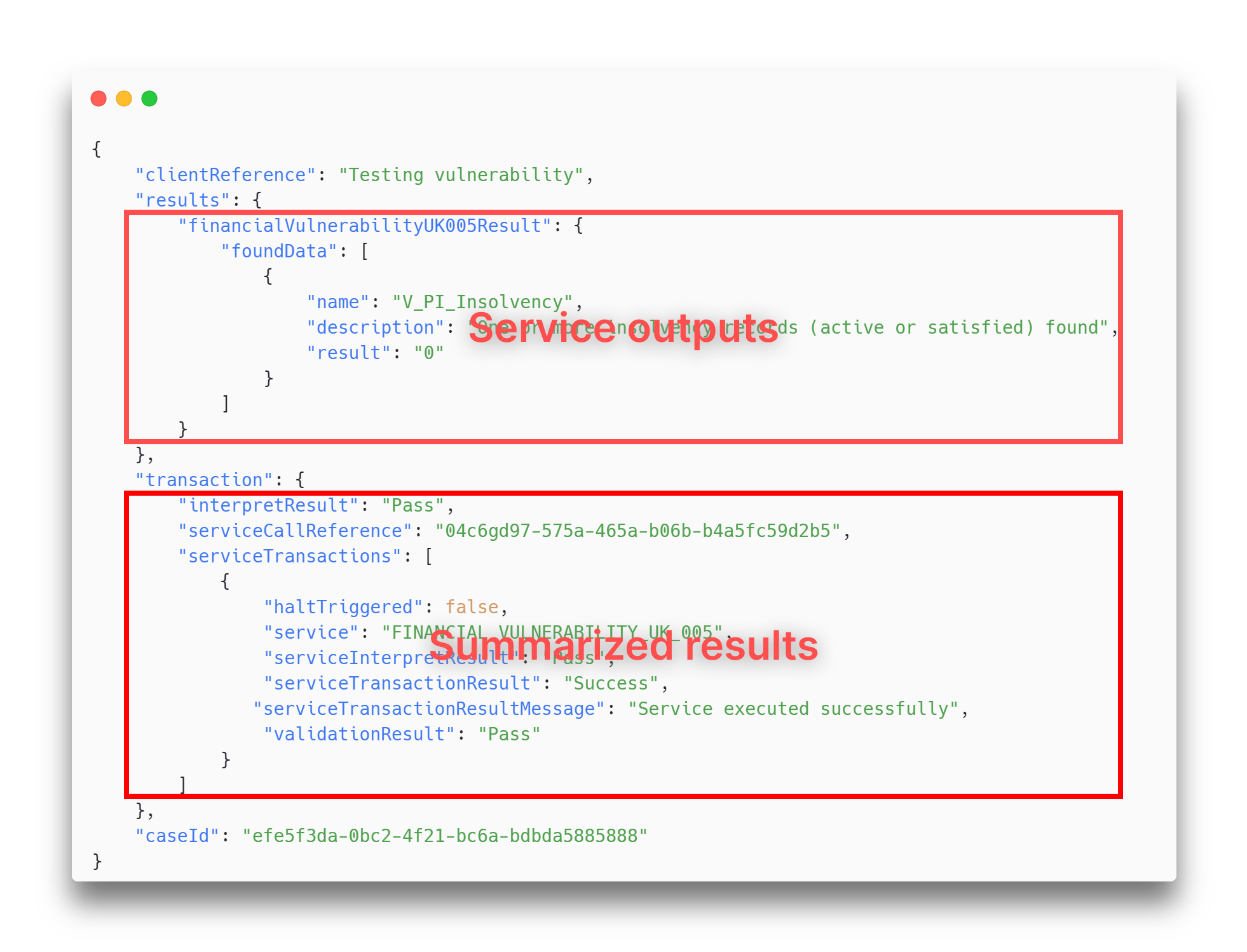 As with all other bundle services the response is separated into two sections: Service specific outputs and the summarized results (Service transaction).